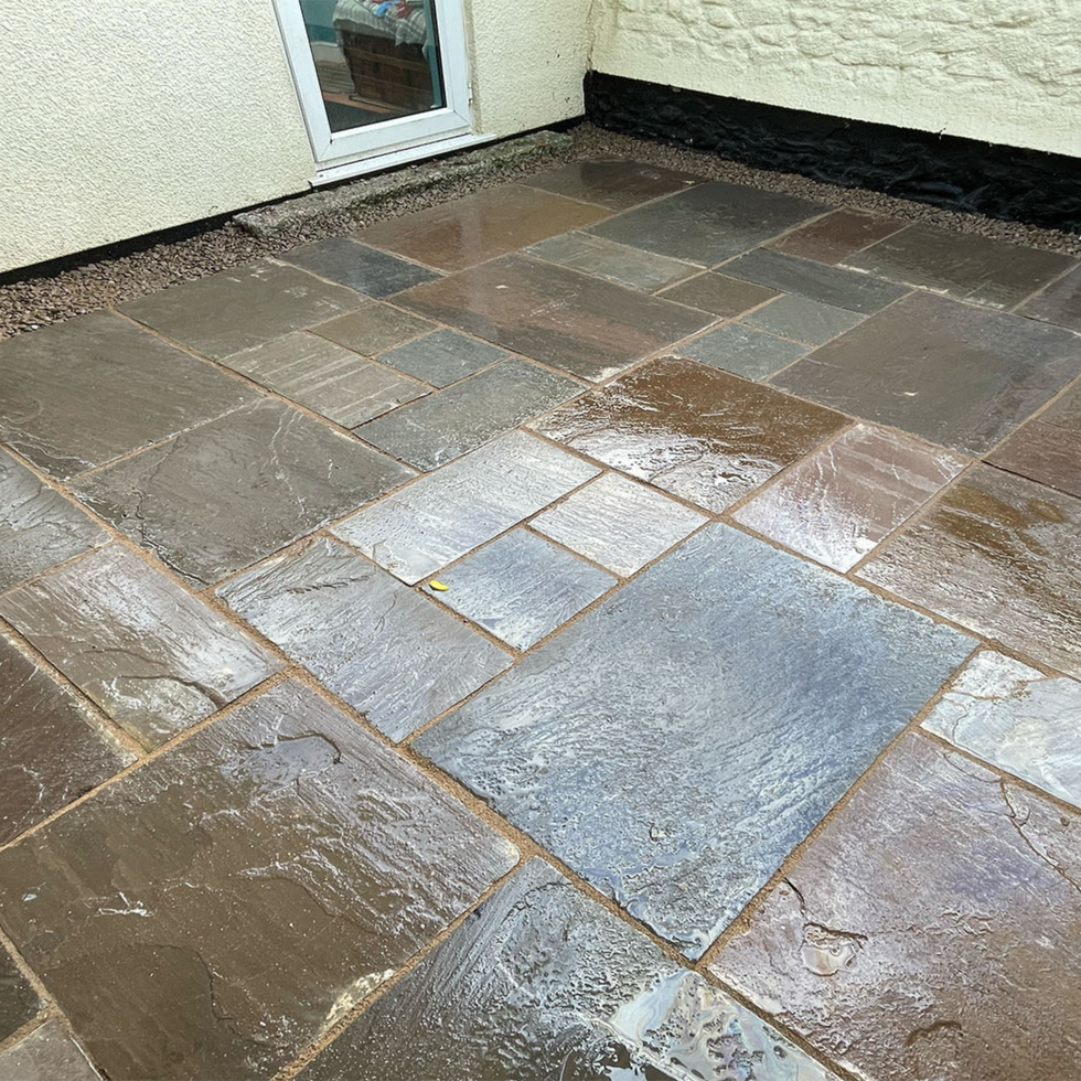This project showcases terraced garden designs with wooden retaining walls, steps, and stone patios. The images depict beautifully landscaped terraced gardens with a variety of patio and garden features.